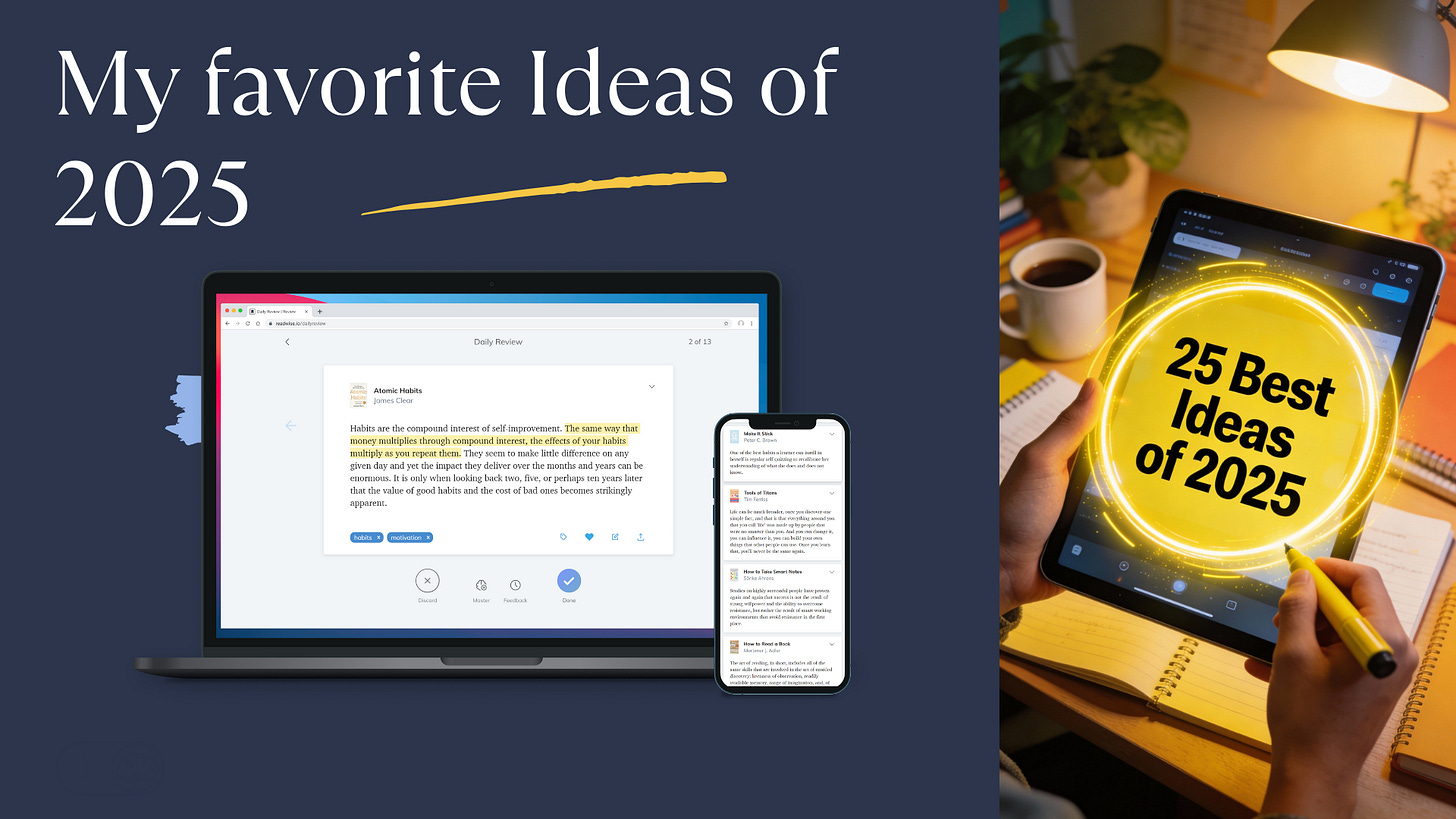 As 2025 came to a close, I went back through my entire Readwise library and pulled out the 25 ideas that hit hardest this year. These aren’t random productivity hacks or trendy advice. They’re the frameworks, principles, and insights that actually changed how I think about work, creativity, learning, and life.