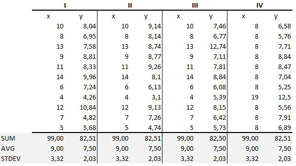 Similarly, the variance of x is 11 and variance of y is 4.13 for each dataset